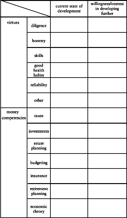 “Start the list with the inner resources and virtues we have already discussed. Next, move on to your relative mastery of the specifics of practical Knowledge such as taxes, investments, budgeting, estate planning, insurance, retirement planning, and economic theory.”